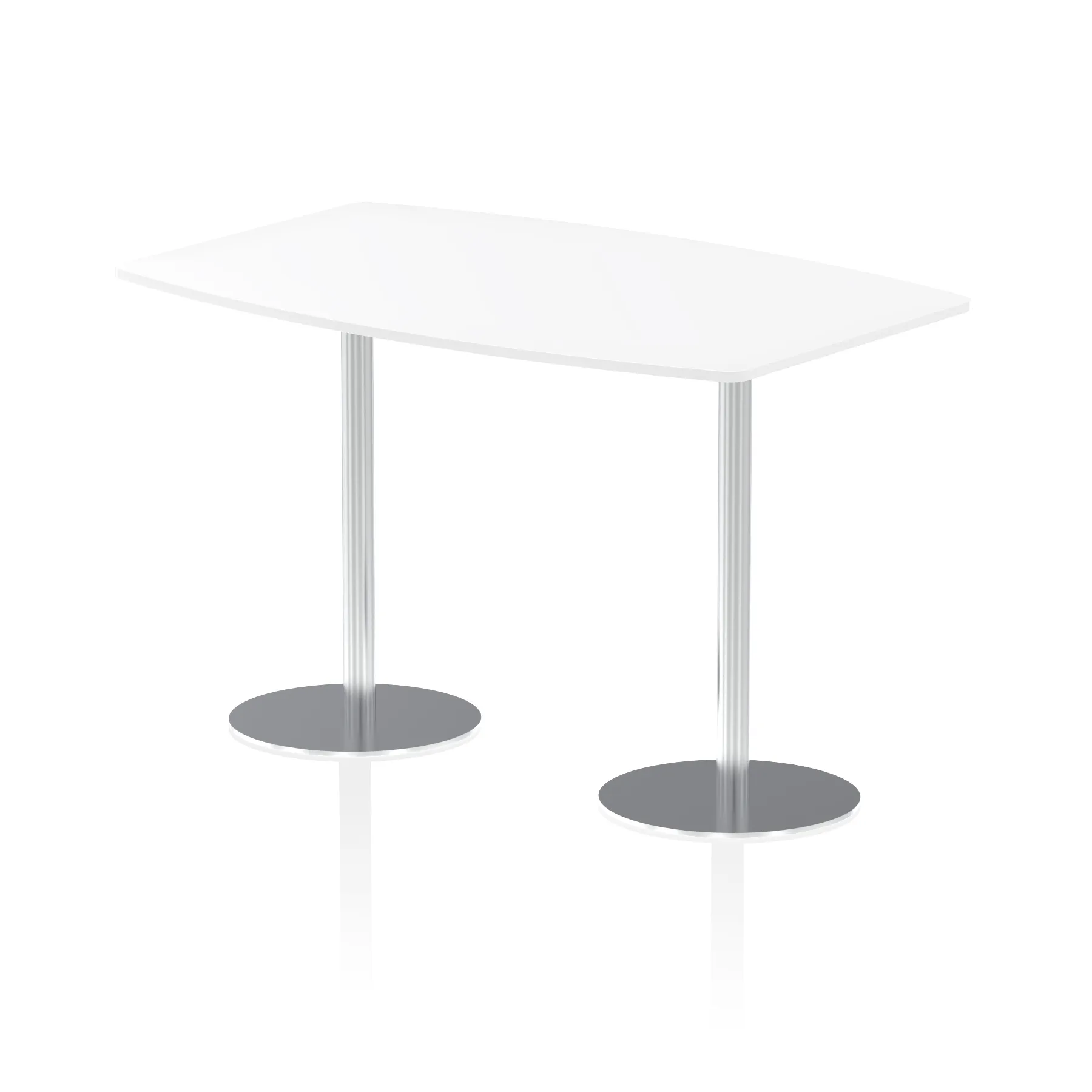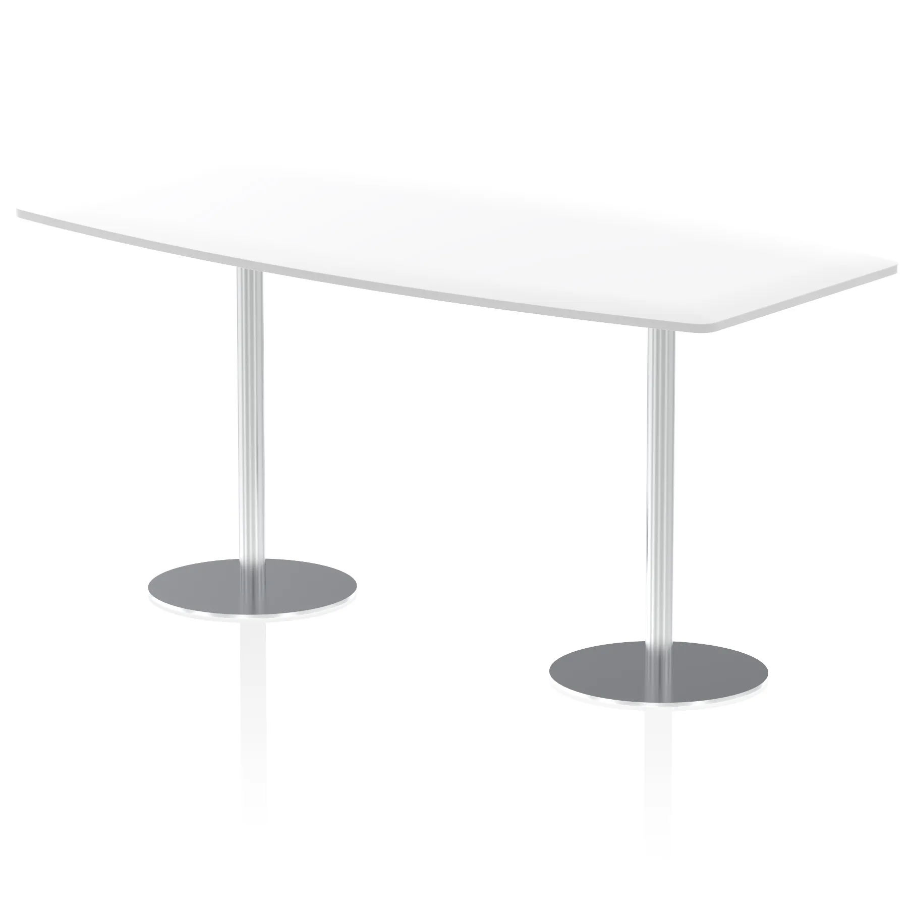25mm thick desk top profile | Dual, brushed stainless steel effect circular base (580mm diameter) | Brushed stainless steel pillars (76mm diameter) | Weighted base provides stability | Writable desk surface