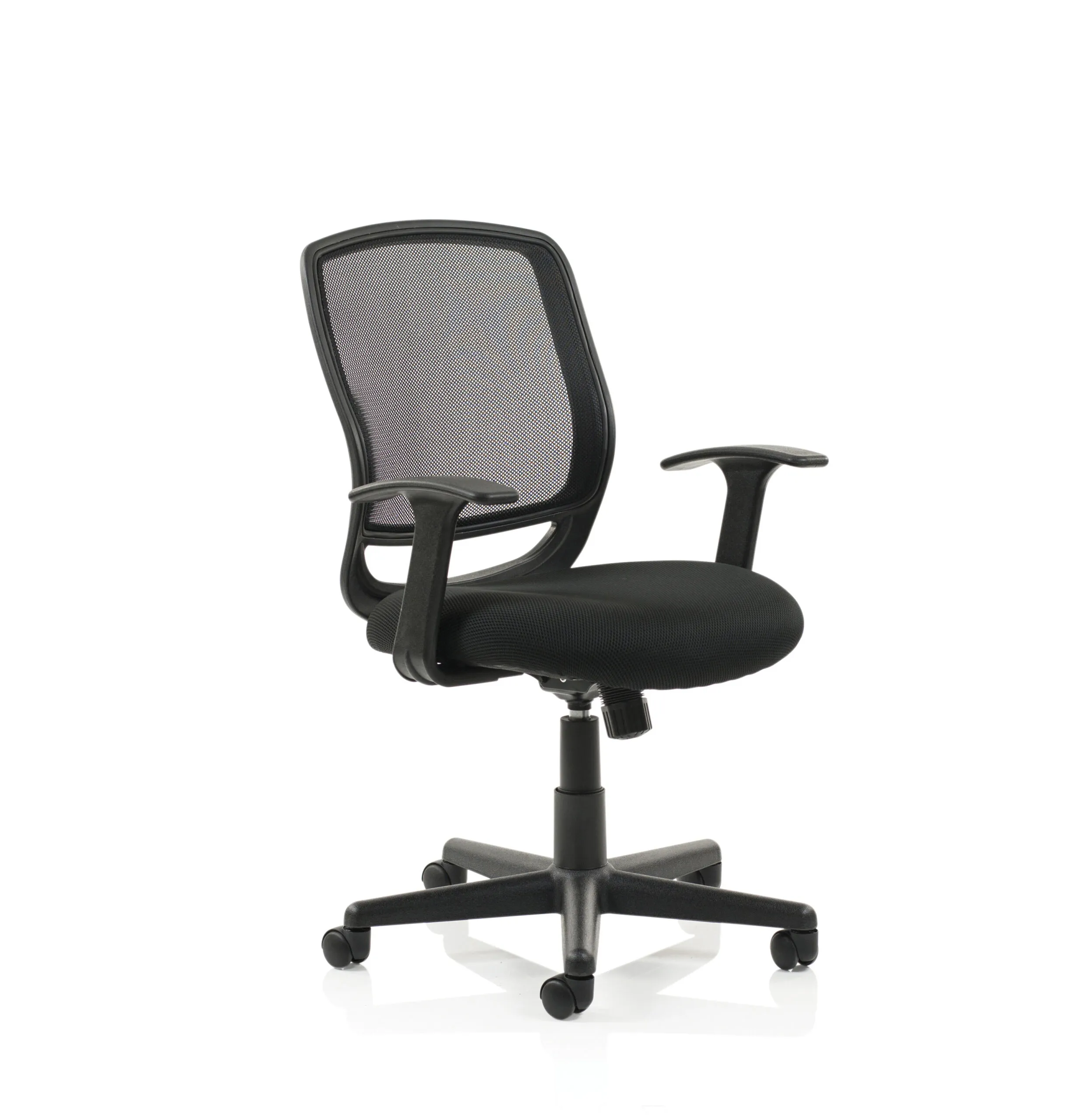 • Full package budget operator task chair • T-Bar arms included • Stay-cool airmesh seat upholstery • Large contoured fine mesh back • One-touch lock and tilt action • Waterfall seat design
