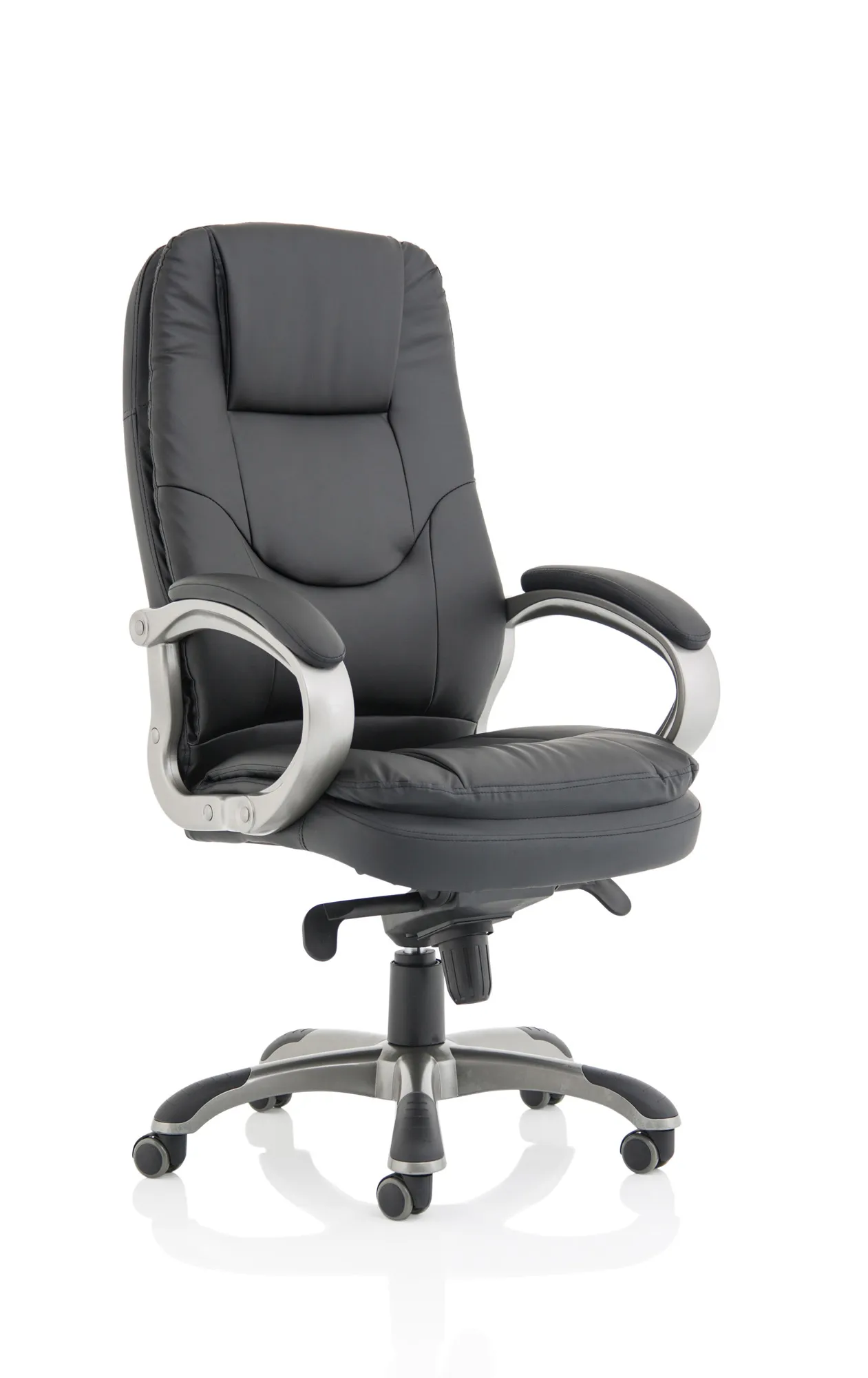 The Oscar executive chair swathes the user in a generously upholstered seating solution that incorporates a luxuriously deep seat and back and big armrests all wrapped in a soft touch faux leather. The stunning gun metal armature and base contrast with dramatic black upholstery. Multiple panels ensure the user is supported in exactly the right place no matter what the demands in the working day