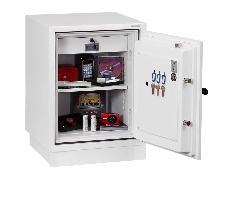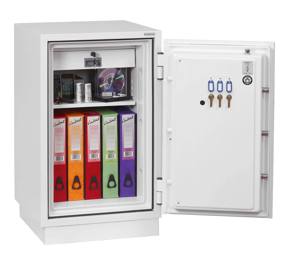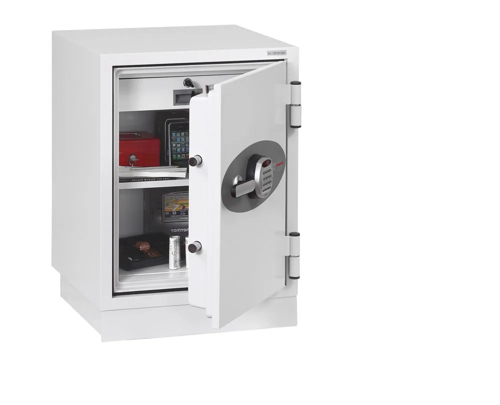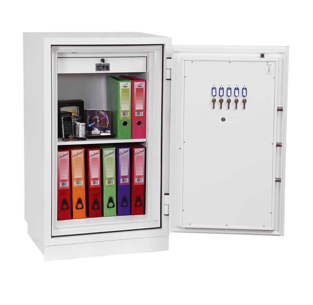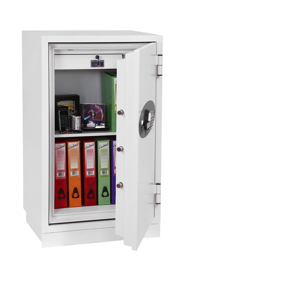 FIRE PROTECTION (PAPER) – Tested to Swedish NT Fire 017 – 90 Paper (Size 1 or 2) or 120 Paper (Size 3), providing up to 90 or 120 minutes fire protection respectively for paper documents | FIRE PROTECTION (DIGITAL MEDIA) – Tested to MTC – DIP120 – 60DM fire test standard, providing 60 minutes fire protection for digital media, DVD’s, USB memory stick and hard drives | SECURITY PROTECTION – The safe is recommended for an overnight cash risk of £2,500.00 or £25,000.00 valuables | DROP TEST – Fire and impact tested from 9.1 metres for resistance to the impact of falling through the burning floors of a building | FITTINGS – Each safe comes complete with height adjustable shelf and lockable cash/valuables drawer | FIXING – Ready prepared for floor fixing with fixing bolts for concrete supplied | SPECIAL FEATURES – Fitted with automatic slam shut door locking | COLOUR – Finished in a high quality scratch resistant paint RAL9003 White
