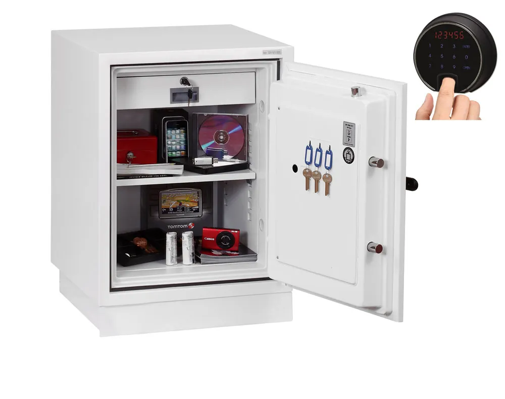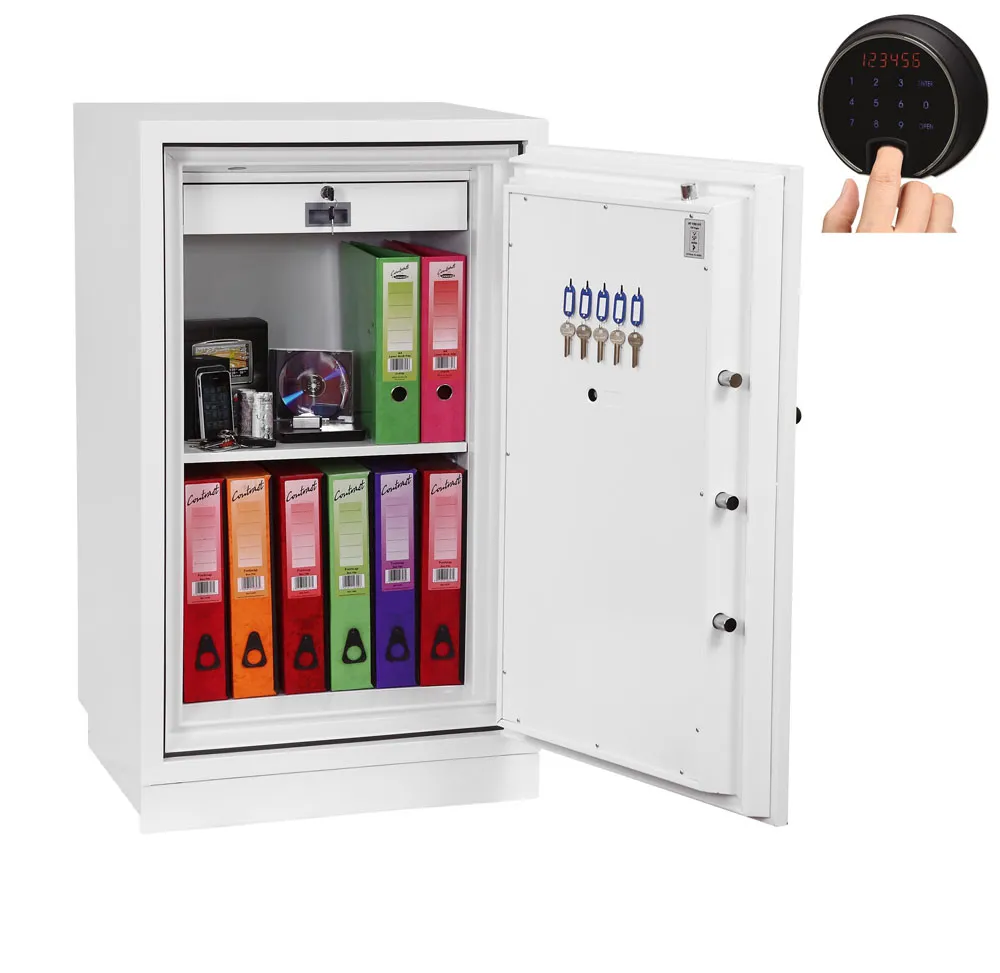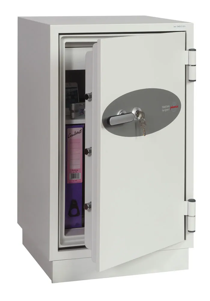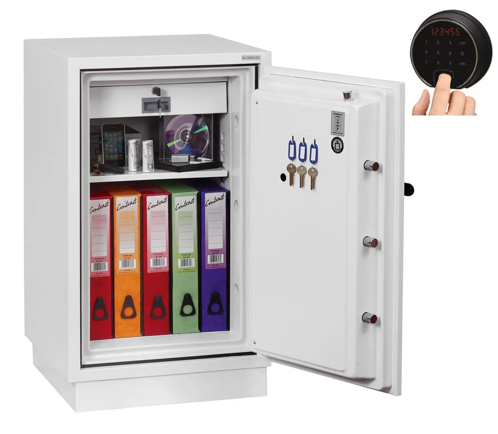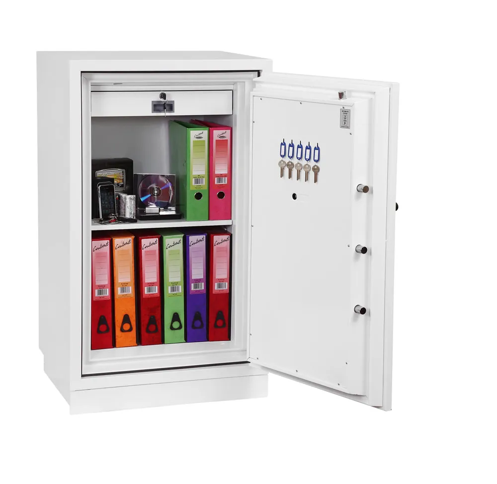 FIRE PROTECTION (PAPER) – Tested to Swedish NT Fire 017 – 90 Paper (Size 1 or 2) or 120 Paper (Size 3), providing up to 90 or 120 minutes fire protection respectively for paper documents | FIRE PROTECTION (DIGITAL MEDIA) – Tested to MTC – DIP120 – 60DM fire test standard, providing 60 minutes fire protection for digital media, DVD’s, USB memory stick and hard drives | SECURITY PROTECTION – The safe is recommended for an overnight cash risk of £2,500.00 or £25,000.00 valuables | DROP TEST – Fire and impact tested from 9.1 metres for resistance to the impact of falling through the burning floors of a building | FITTINGS – Each safe comes complete with height adjustable shelf and lockable cash/valuables drawer | FIXING – Ready prepared for floor fixing with fixing bolts for concrete supplied | SPECIAL FEATURES – Fitted with automatic slam shut door locking | COLOUR – Finished in a high quality scratch resistant paint RAL9003 White